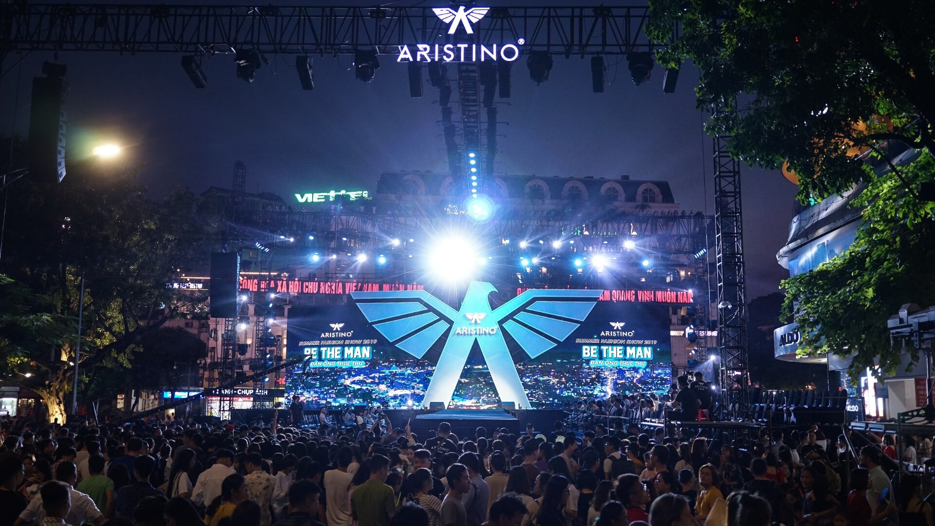 For the first time, Aristino brought its Summer Fashion Show to Hanoi’s pedestrian walking street, culminating in a spectacular finale at Đông Kinh Nghĩa Thục Square and attracting over 50,000 attendees in a single night. Inspired by the grandeur of the Roman Colosseum, the stage was dominated by a monumental eagle symbol — representing the brand’s ambition and soaring spirit. With dramatic lighting, immersive staging, and explosive production, the cultural heart of Hoàn Kiếm was transformed into a grand fashion arena.